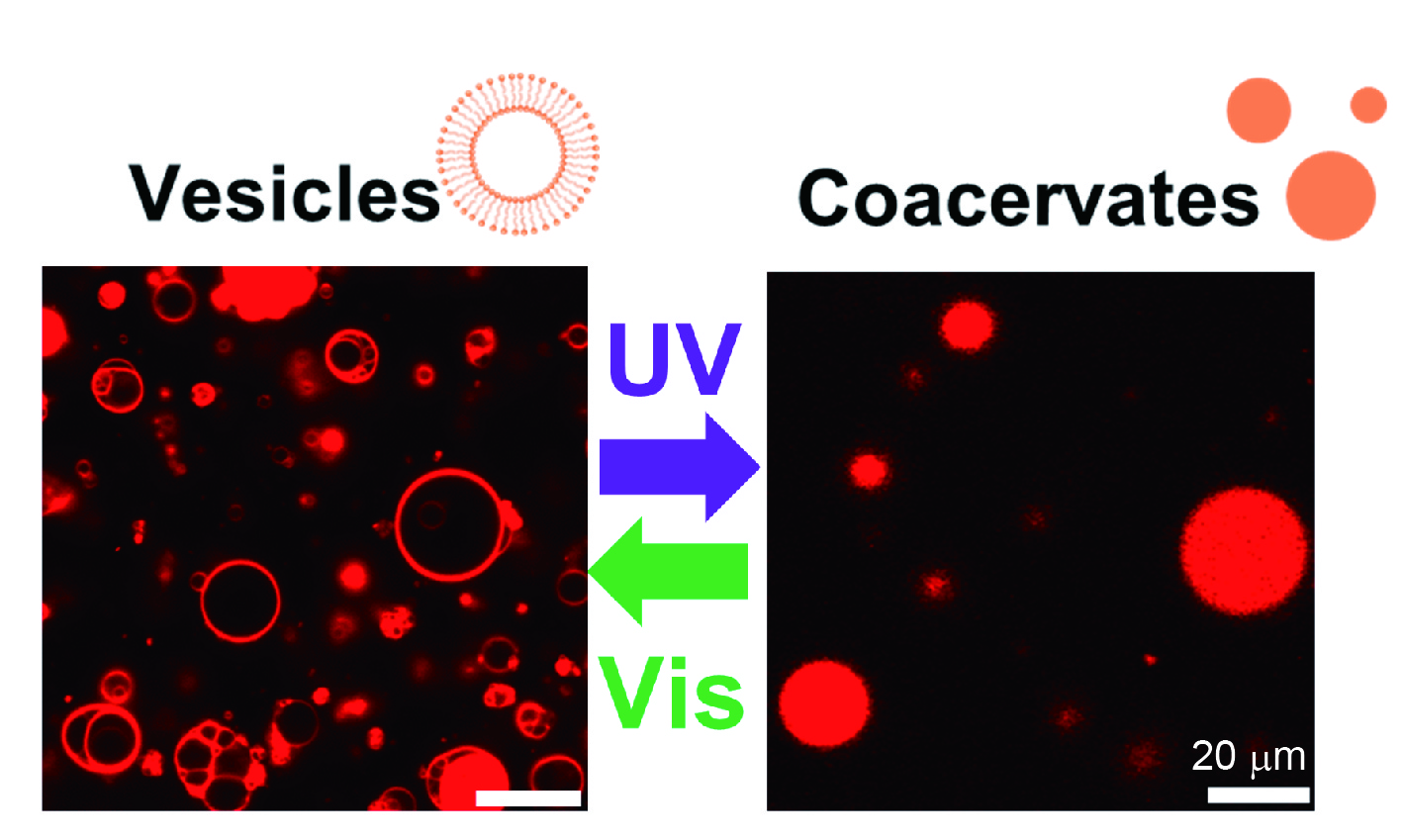 最近では光やpH応答性の低分子および高分子の両親媒性分子を配合したジャイアントベシクルが,刺激を与えると変形しながら外水相から物質を取り込んだり,コアセルベートや分子結晶などの別の分子集合体へと構造転移したりする現象の誘導に成功しています(下図参照)。特に液-液相分離により生じるコアセルベートは,生命の起源を考えるうえで重要な構造体と言われており,このような研究を進めることで生命誕生の秘密に迫ることができるのでは,と考えています。さらに,化学反応を介してベシクルが高次な機能を獲得する化学システムの創成を目指した研究も進めています。